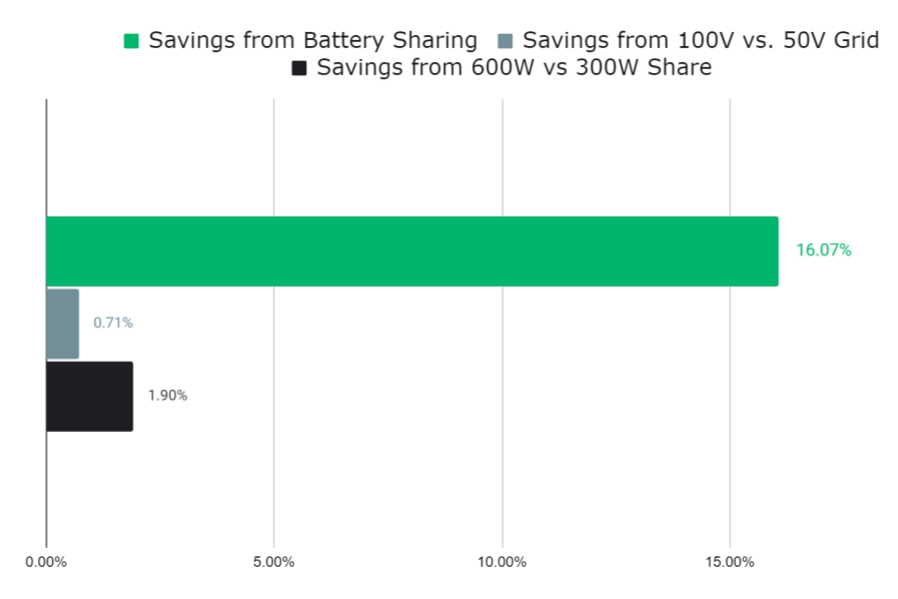 For example, take three homes, each with a standard 100Ah battery, and then one house increases its daily usage to 2.4kwH, a second house increases to 1.8kWh, and a third home maintains a 600Wh load. BPS can reduce blackout hours by 88% and bring the average time spent in blackout from 15% down to 2%. The exact reduction of blackout hours will vary depending on the specific grid conditions, but clearly, the effect can be substantial. One caveat is that BPS will have less impact if all systems are oversized or if all homes grow their load usage simultaneously. But in reality, homes scale up at different times and developers want to limit oversizing, so BPS can make scaling networks smoother and more profitable.