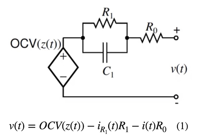 The Thévenin ECM is a tool that allows us to express the battery’s terminal voltage as a function of its open-circuit voltage (OCV) and voltages losses. Note that z(t) is the SoC at time t, and OCV is a function of SoC alone.