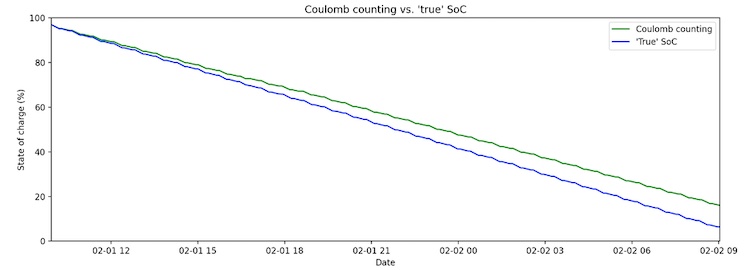 Coulomb counting can easily diverge from the true SoC between calibration points (full charge or discharge), even when the magnitude of error at each time step is very small.