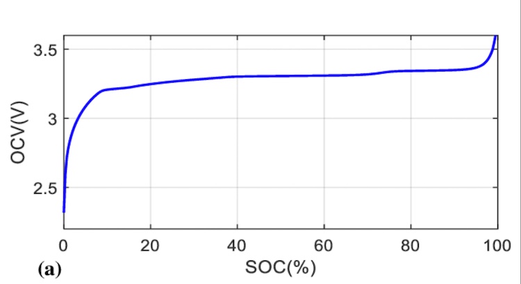 An OCV mapping from the literature is shown above. Note its nonlinearity as well as the flatness of the curve in the mid-range of SoC.