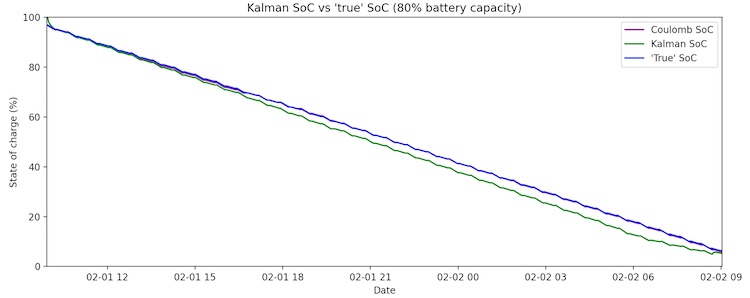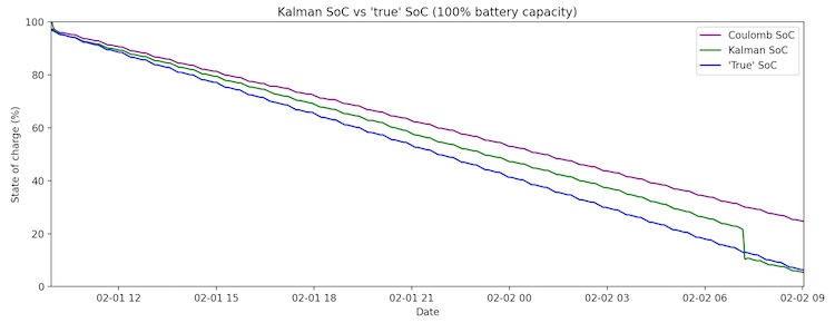 In order to tune the Kalman filter and evaluate its accuracy, we completely discharged a battery using current pulses of varying intensity. When we calculated the final SoC (using the final resting voltage as our OCV) and summed up the total load drawn from the battery over the course of the experiment, the battery capacity turned out to be ~80% of the rated capacity. The Kalman filter’s feedback loop is adaptive, but it is still difficult to overcome such a large discrepancy in a parameter as critical as battery capacity. We see that with the battery capacity set at the rated capacity, the Kalman SoC estimate slowly diverges from the true SoC until it is able to sync up at ~15% SoC as the battery’s voltage dissipates.