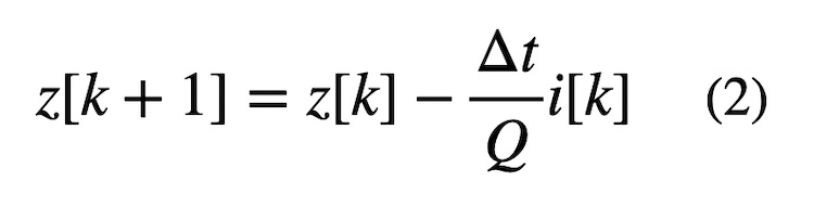 With each new sensor value received, several steps are taken to update the SoC estimate. First, we predict the new SoC value using the previous SoC value and measured current, as well as the time between updates. This is done using a Coulomb counter, as shown below. Note that Q represents the battery’s capacity.