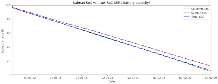 While it is encouraging that the SoC syncs up with the true value eventually and performs significantly better than a Coulomb counter (5% root mean squared error compared to over 11%), we would like to improve our accuracy further. In order to do this, we adjust the battery capacity to line up more closely with reality. Using 85% of the rated battery capacity, we find that the Kalman SoC lines up almost exactly with the expected SoC.
