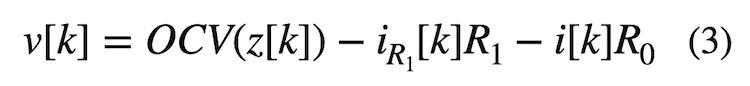 Next, we feed this predicted SoC value into the Thévenin voltage equation (3), which defines a relationship between open circuit voltage (OCV), battery current, and terminal voltage (voltage of the battery while loaded) at time step k. This allows us to solve for the predicted battery terminal voltage, v[k], using our SoC prediction from the previous step.