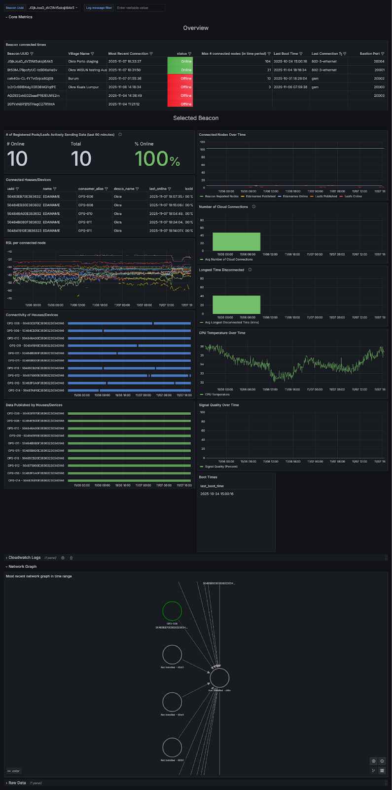 The turning point was a lightweight service that reports Beacon telemetry over MQTT. After a few iterations, that data now powers our Grafana “OkraNet” dashboard, which surfaces: