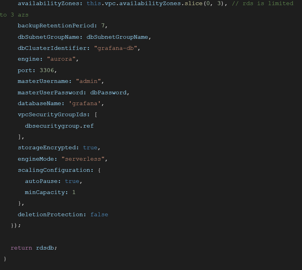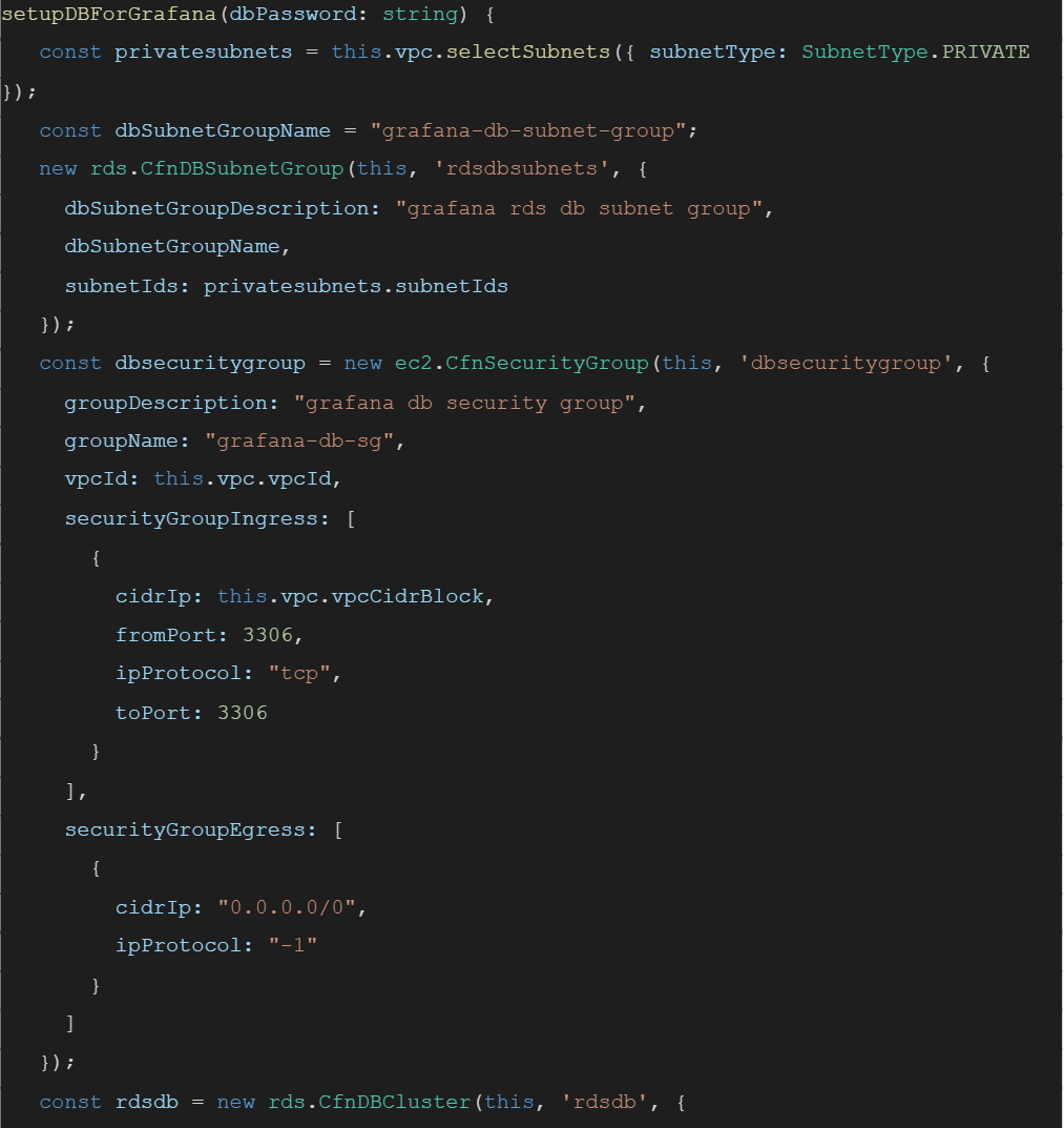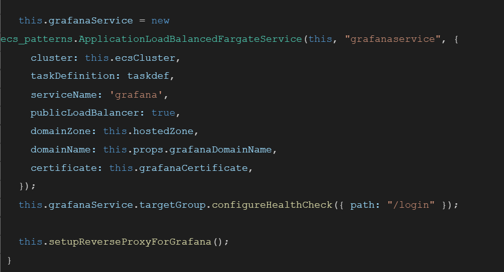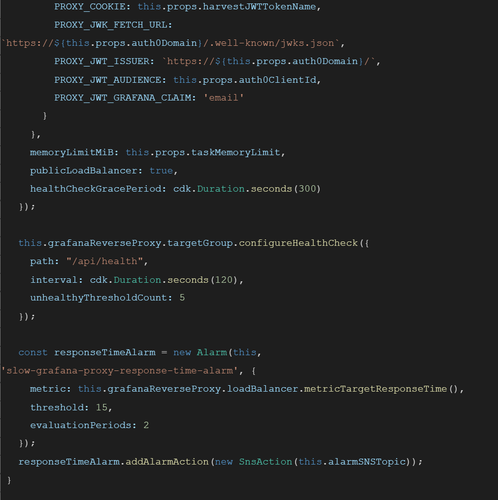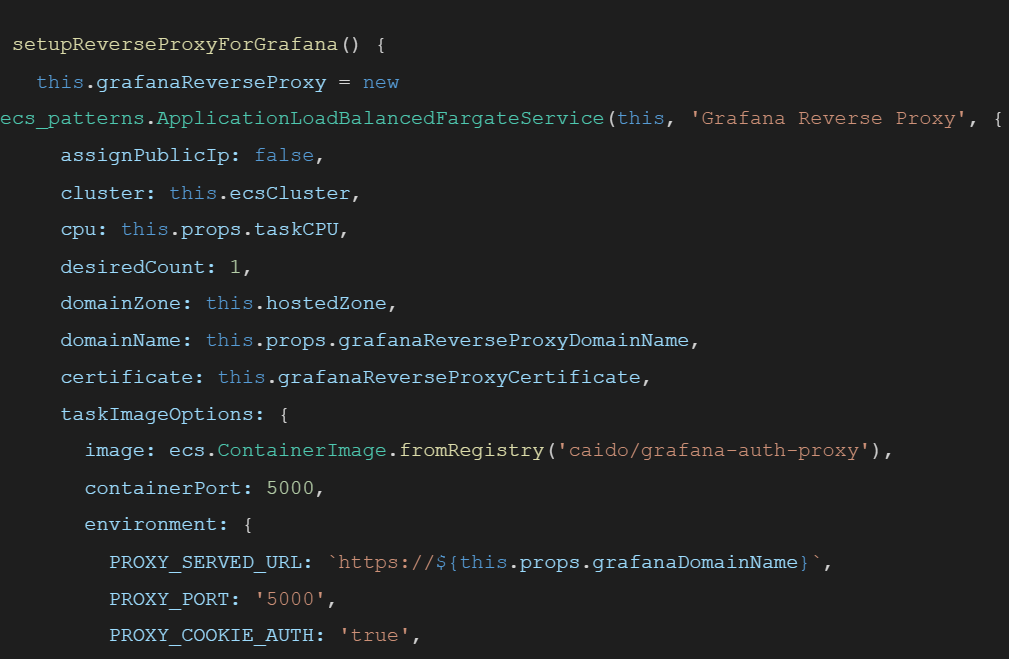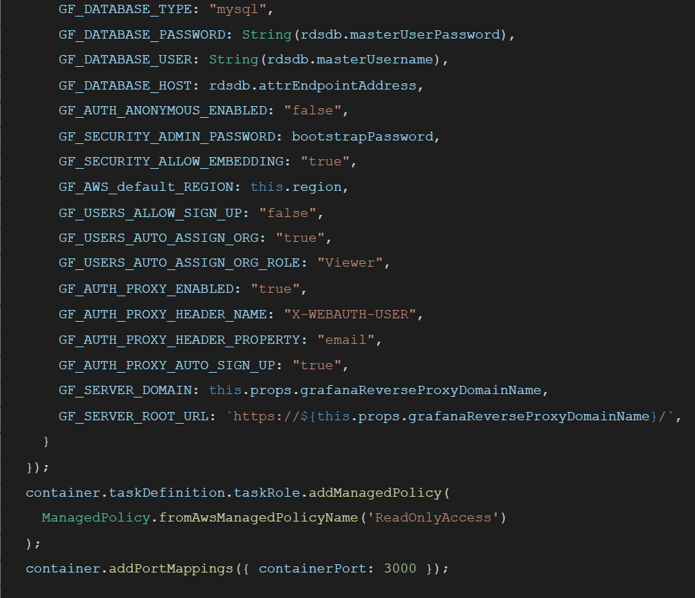 Here’s the CDK code. Note the environment variables passed to Grafana to allow use of auth proxy.