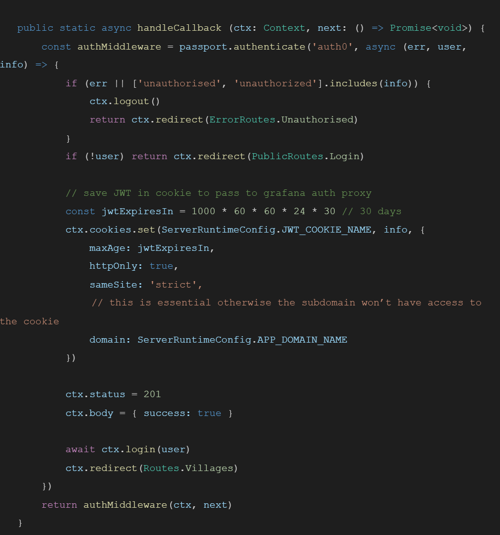 We need to pass the JWT to our auth proxy so that it can check whether the user should be allowed to access Grafana. I chose to store the JWT in a cookie (same-site only and http-only for security) because it was the only viable option supported by caido’s excellent grafana auth proxy docker image. At first I tried using headers but that’s a trap – it will work for the Grafana HTML but not for any of the assets (JS, CSS, etc.).