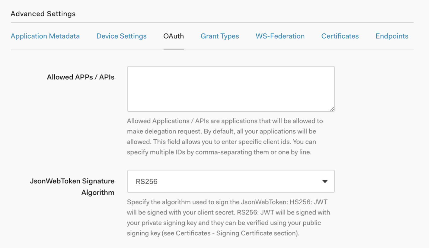 You’ll find this under advanced settings. RS256 is the most secure method and the only one that will work with the auth proxy I found.