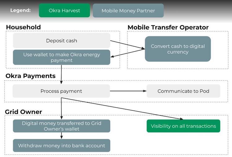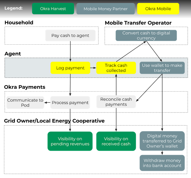 Considering that Okra’s first markets have all been in SE Asia, where mobile banking penetration is far behind that of many regions in Africa, it wasn’t realistic to expect every household would have a smartphone where they could manage converting cash to digital currency and paying directly for Okra energy. But it also wasn’t realistic to expect our utility partners to go out to remote communities and collect cash, since they’d likely end up spending more in collecting cash than the cash they would be collecting. And as an additional layer of complexity, even though our platform manages each transaction record and household balance, the cash isn’t ours. The cash needs to make its way to the grid owner, investor or energy cooperative, depending on the deal structure and local regulation.