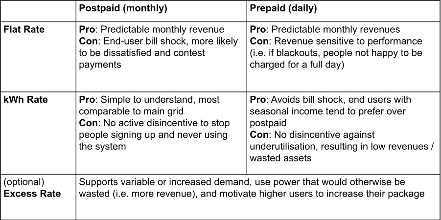 As we began working with different partners in different markets, it seemed like everyone needed to use a different billing structure. Some wanted houses to pay per kWh because it might be simpler to understand, and some preferred to set a daily or monthly flat-rate to make revenues more predictable. Some wanted postpaid to match grid electricity billing, and others wanted prepaid to ensure accountability by disabling systems without credit. Some wanted to enforce a limit and shut off homes that exceed and others wanted to let homes consume as much as possible.