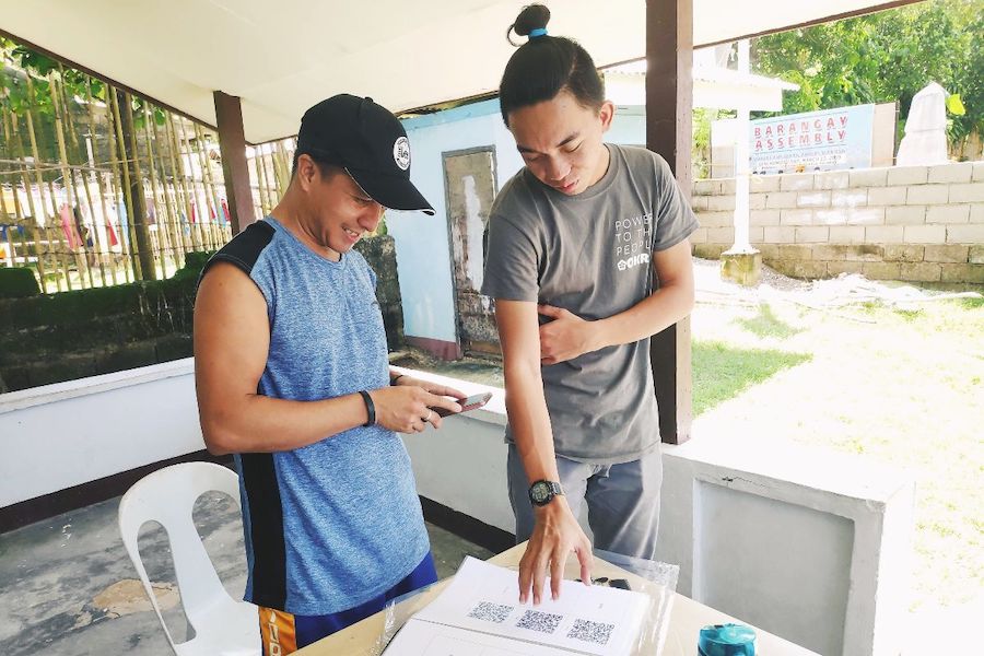 Okra field staff teaching a local maintenance agent how to manage mobile payments