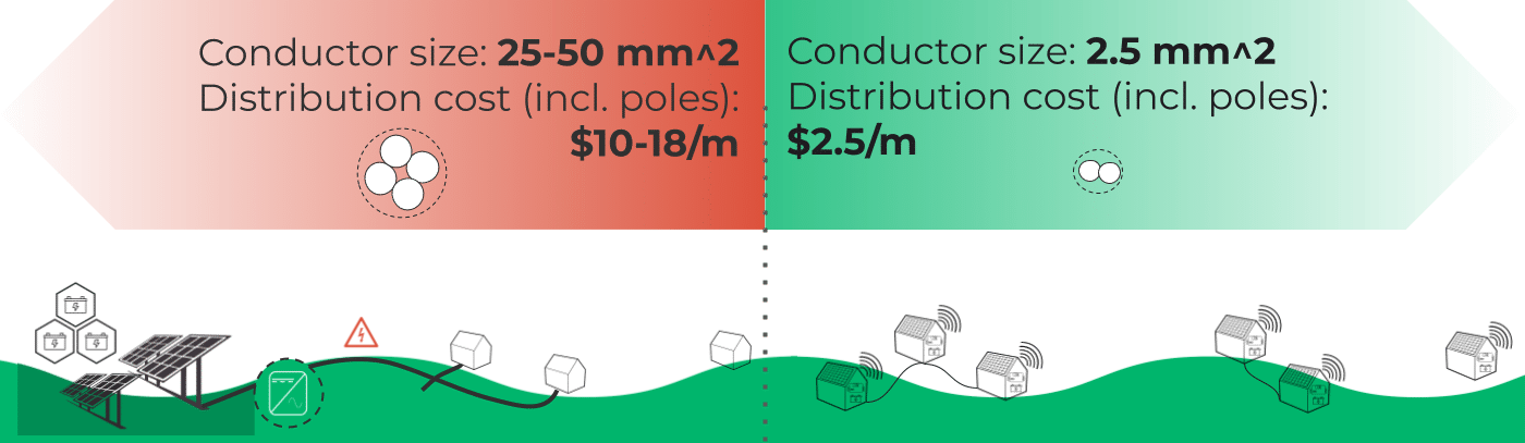 A primary advantage of decentralizing generation and storage is that it significantly reduces the total amount of power moving throughout a network, as energy is mostly generated and consumed by the same household and any excess is optimally sent to nearby homes. This node-to-node distribution in mesh-grids requires 10x thinner cables, reducing distribution costs by 90% compared to centralised mini-grids.