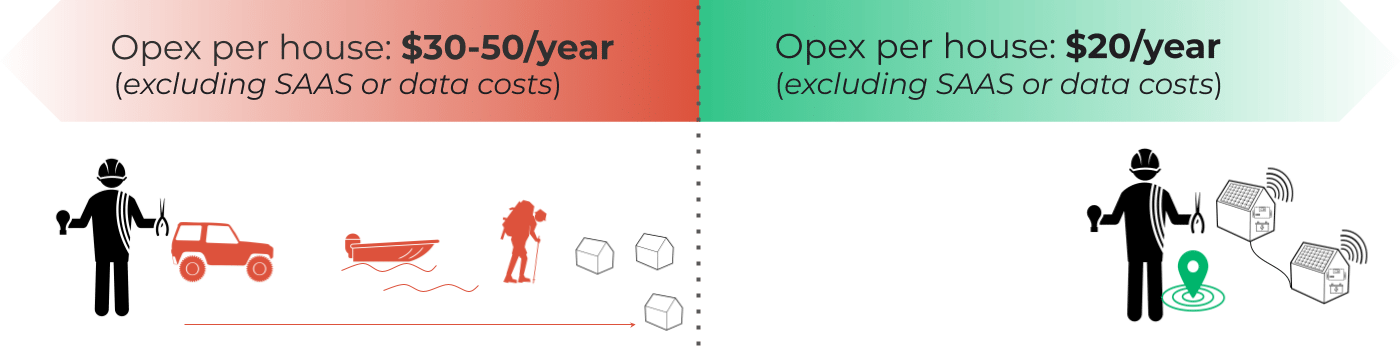 The main drawback of deploying mini-grids at the last-mile comes from the high-cost of distribution assets (poles, cables, inverters). Safely distributing power over long distances, whilst also accounting for peak utilization, necessitates high-voltage and high-current cabling, heavy duty transmission poles and large inverters – all of which can only be serviced by licensed technicians who need to travel far and wide to reach the site. In the event of failures, it’s expensive and slow to perform maintenance and the quality of service suffers.