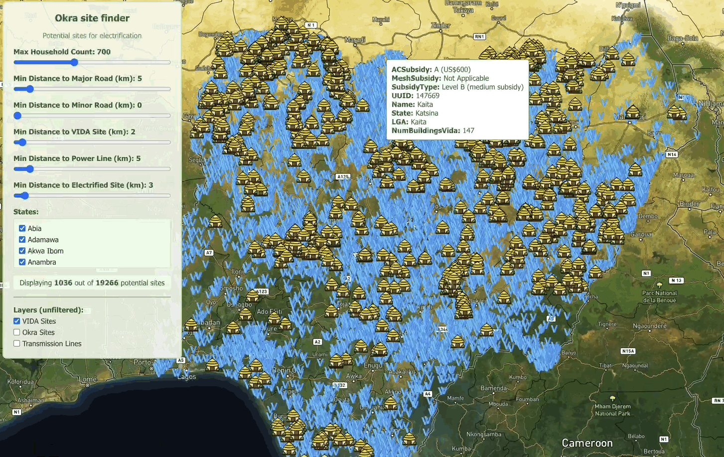 Firstly, I want to shoutout the Vida geospatial tool - it’s an awesome tool layering a bunch of useful data and should be the first point of exploration when trying to figure out what your DARES pipeline Nigeria should look like. The tool has a bunch of useful information, from grant eligible sites, grant amounts, distance from main roads etc.