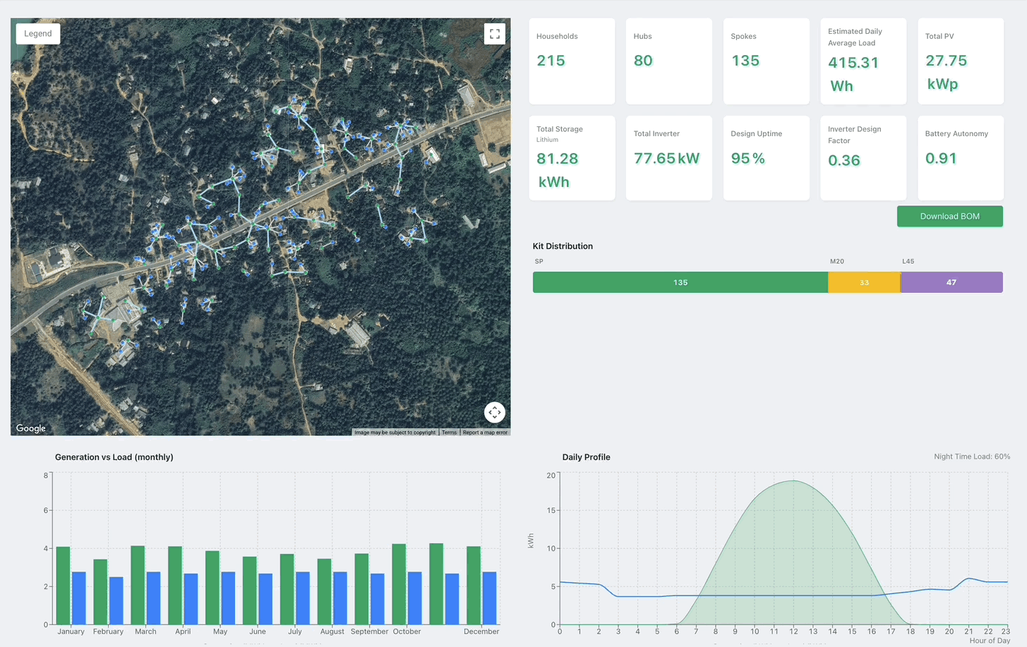 The network planner applies an energy demand forecast for all end users, takes into consideration location of users, time of use, and matches that up to size the kit variants with an objective to reduce capex while maintaining the target up-time (95%+ or 98%+ based on what's set in the network planner).