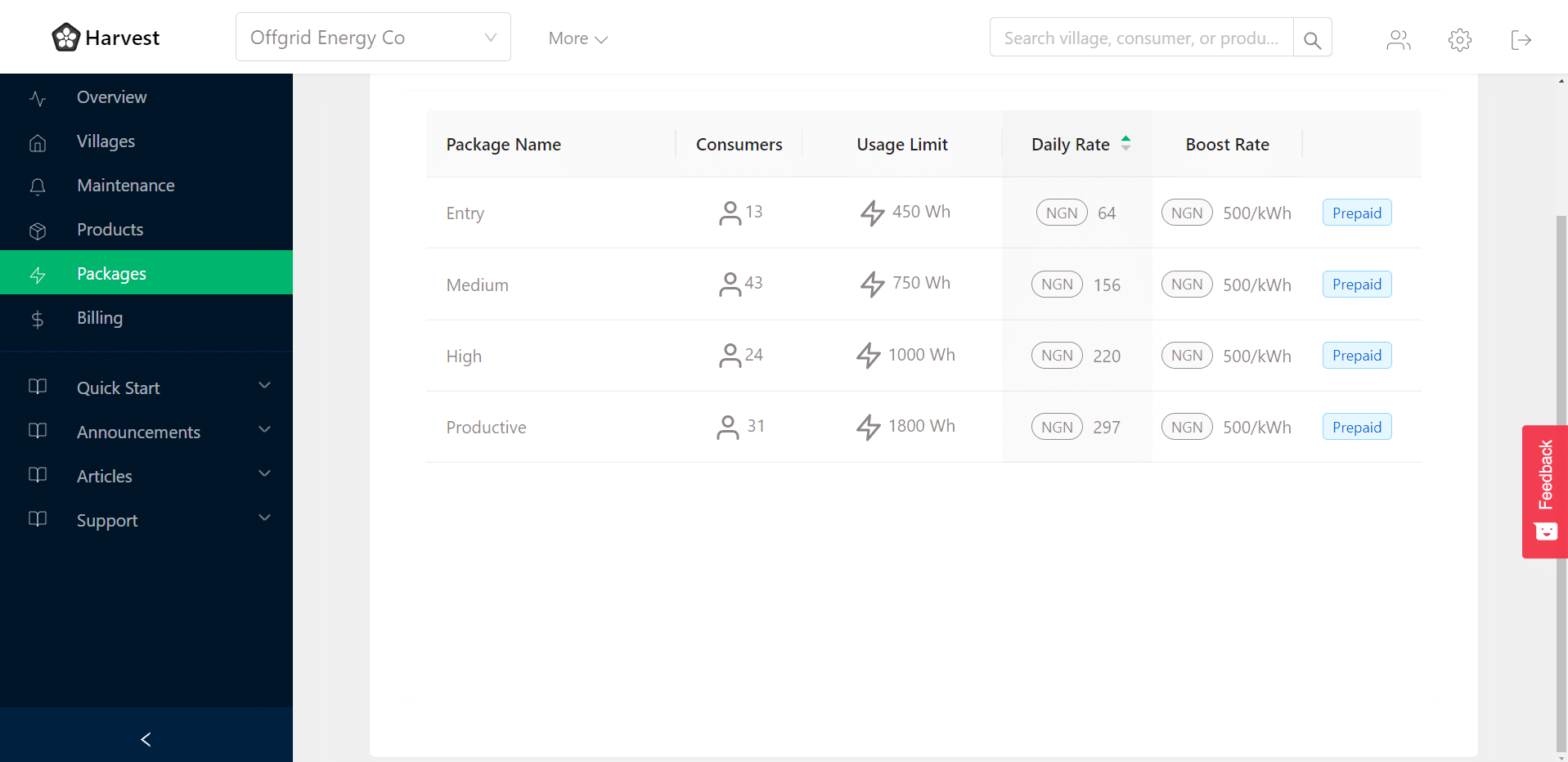 In order for developers to run a sustainable last-mile electrification business, tariffs often need to be iterated and optimised to ensure sufficient returns – this has traditionally been a large technical and communications challenge. We recommend using the Harvest platform, connected to OMGs, which makes custom configuration of energy tariffs easy for every community. Once tariffs are updated on Harvest, households automatically receives an SMS of the updated package, and the Pod billing screen reflects the changes immediately.