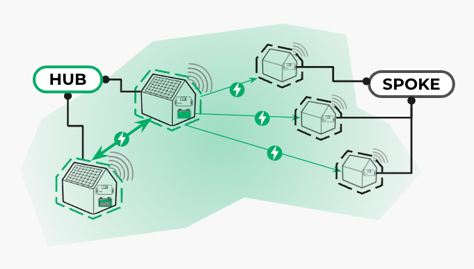 Solution: They installed a “Hub & Spoke” mesh-grid topology, which has battery and generation capacity installed at “Hub” households who receive primary service. Any excess power generated is shared to nearby “Spoke” households for secondary service.