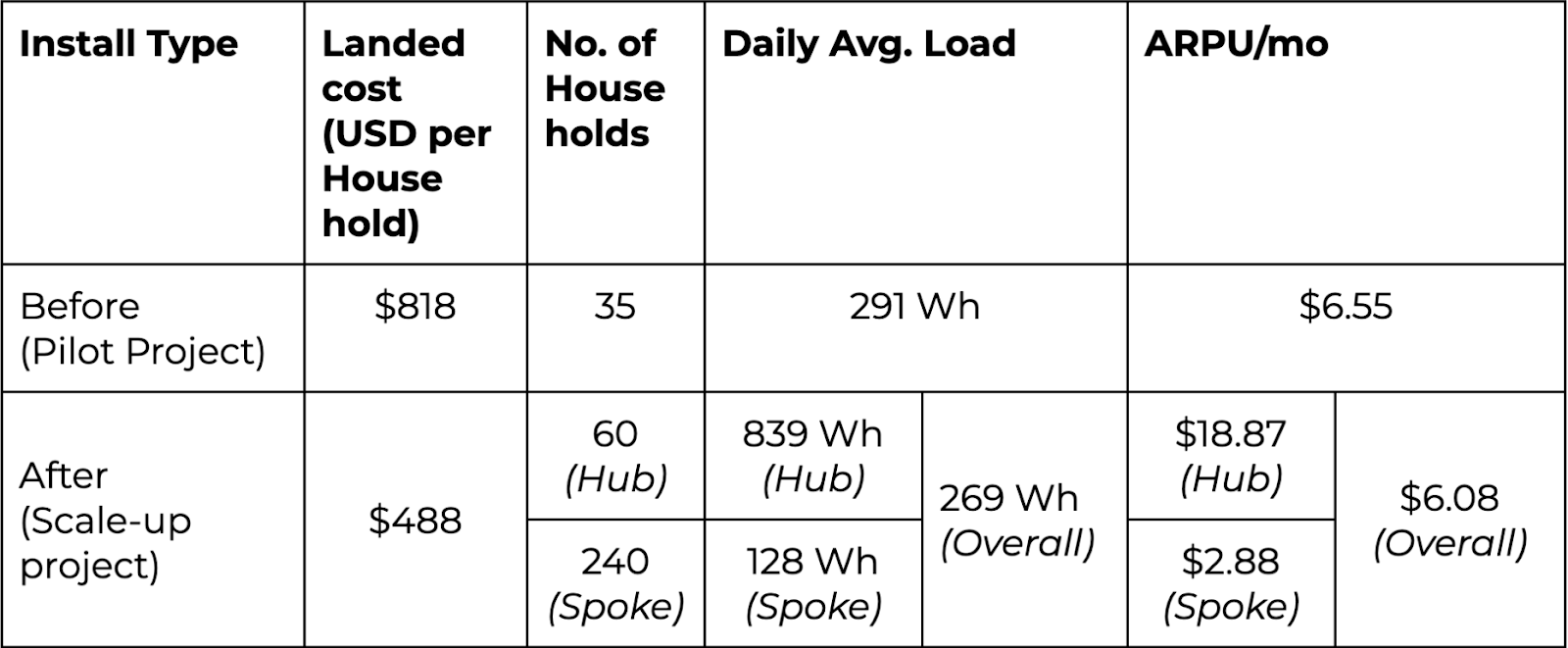 As of August 2023, the 300 household scale-up project has been deployed for over one year. The Hub & Spoke implementation has enabled both productive usage for the community’s Hubs as well as cost-effective electrification for lower tier consumers. Below, the scale-up project breakdown is shown in comparison to the 35 household pilot project.